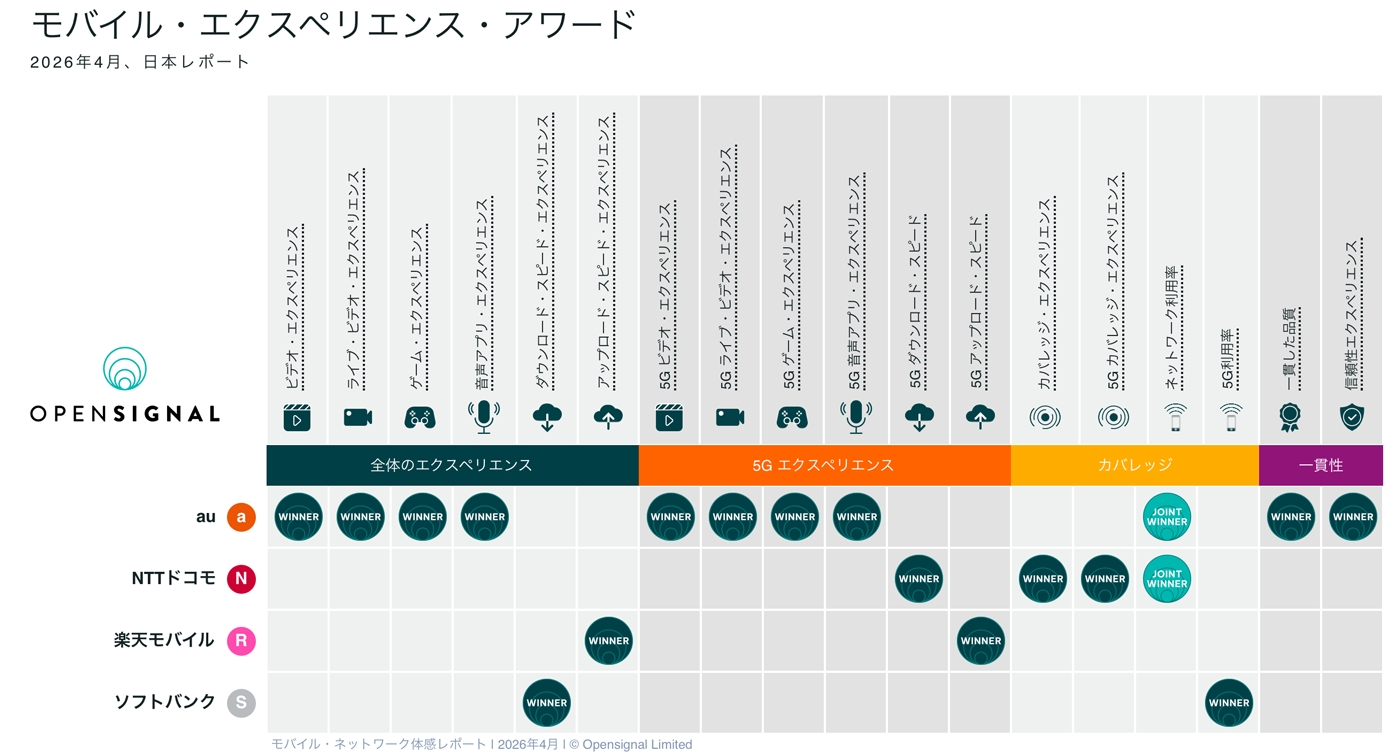 KDDI、沖縄セルラー(powered by the KDDI network)は、グローバル分析会社Opensignal社が2026年4月23日に発表した、日本市場の「モバイル・ネットワーク・ユーザー体感レポート」(以下 本レポート)(注1)において、全18部門のうち11部門で1位を獲得し、国内MNOでは最多受賞となりました。これにより、過去3回(2024年10月、2025年4月、2025年10月)の同レポートに続き、4連覇(4期連続で最多受賞)を達成しました。
