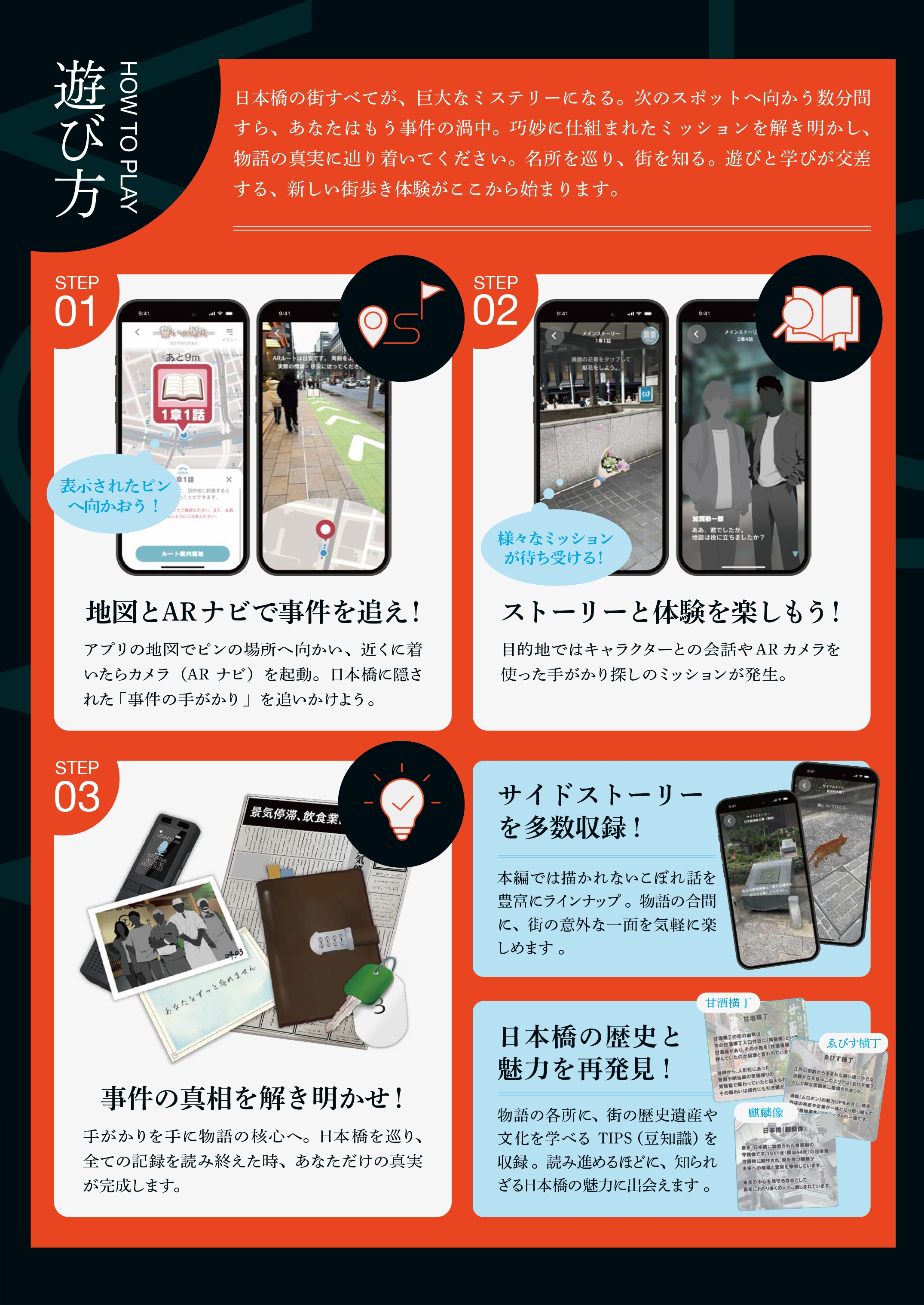 日本橋で起こった事件の謎を解くために、日本橋の名所などのスポットを巡ってシナリオを入手し、物語を読み進めて推理をしながら、日本橋周辺を探訪していきます。スマートフォンのカメラをかざして楽しむARや位置情報の技術を用いて、物語の世界と現実の街並みがリンクする没入感のある街歩き体験を提供します。