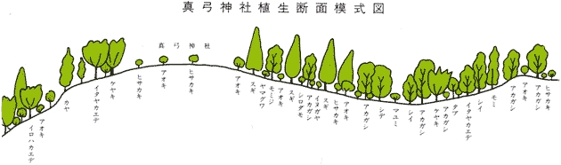 本地域で自然林に近い林相をもつものに真弓神社神域一帯が上げられる。南北に走る稜線の東側と西側とにまたがる社殿を中心に、160,000平方メートルに及ぶ豊かな森を形成しています。社殿の東南の谷及び参道一帯には杉の大木が林立し、特に爺杉は圧巻です。