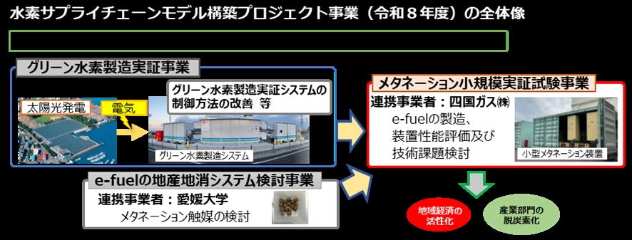 県では、水素エネルギーの使途拡大・エネルギー転換の促進を図るため、令和5年度以降、国補助金(エネルギー構造高度化・転換理解促進事業費補助金)を活用し、四国電力株式会社、三浦工業株式会社、国立大学法人愛媛大学と連携して「水素サプライチェーンモデル構築プロジェクト事業」に取り組んでいるところです。