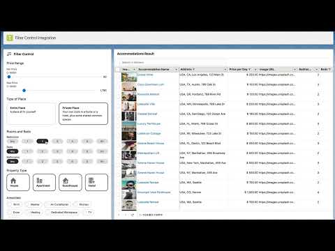 この例では、フィルタ条件を指定するために、ユーザの入力を受け取るカスタムの制御コンポーネント(画面左)を開発、制御コンポーネント内でユーザが入力した情報を、Mashmatrix Sheetに対してパラメータで送信、画面内のSheetコンポーネント(画面右)では、パラメータの条件をもとに検索結果を表示しています。