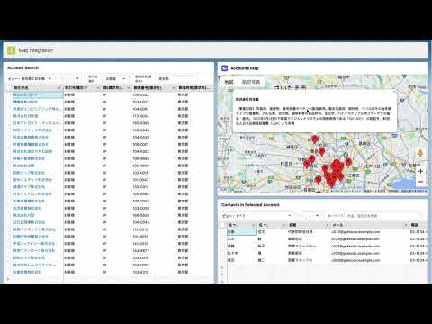 この例では、Mashmatrix Sheetで取引先を検索、Sheetコンポーネント内に一覧表示(画面左)した上で、取引先シートの検索結果をカスタム開発した地図コンポーネント内で取得、住所情報をもとに地図上にプロットしています。
