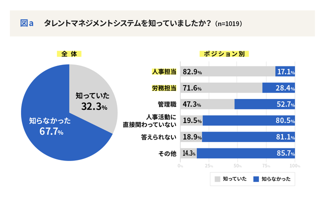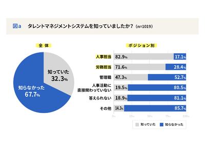 「タレントマネジメントシステム」は、企業に属する人材のあらゆる情報を可視化し、戦略的に人材を育成し配置するなどの機能を備えたシステムです。この「タレントマネジメントシステム」について知っているか尋ねたところ、「知っていた」と回答したのは32.3%に留まり、「知らなかった」との回答が67.7%と多数派になりました。一方でポジション別に見ると人事担当の約8割、労務担当の約7割は「知っていた」と答える結果となり、逆転して多数派となりました。