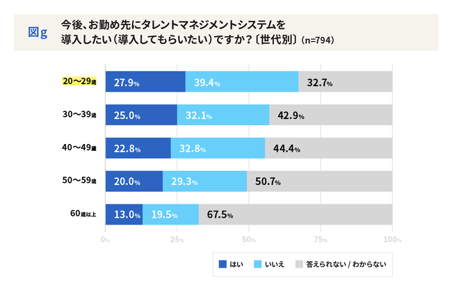 同じ質問の回答を世代別にみると、「はい」と肯定的に答えた割合が一番多いのは20代でした。常日頃から急激な少子高齢化に伴う労働力人口減少を耳にしながら、ウィズ&アフターコロナ時代の労働力を担う存在だけに、企業が「タレントマネジメントシステム」などで貴重な人的資源をいかに合理的で公平にマネジメントできるかを冷静に判断しているのかもしれません。