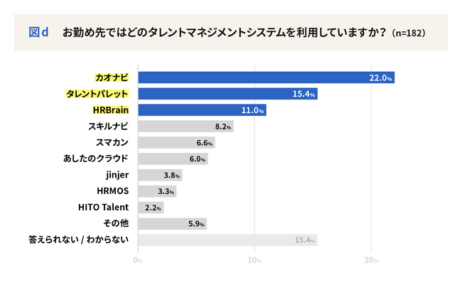 利用しているサービス・製品名について訊ねると、第一位「カオナビ」、第二位「タレントパレット」、第三位「HRBrain」という結果になりました。人材の育成や人事評価を可視化するだけではなく、採用などマルチな機能も備えたサービスが人気であることがわかります。
