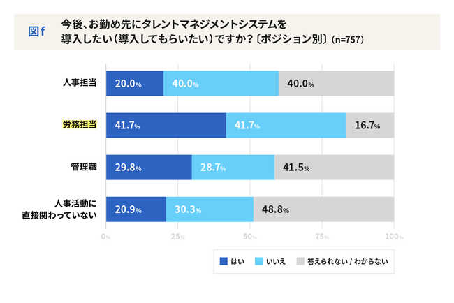 最後に「タレントマネジメントシステムを導入したいか否か」について質問したところ、「はい」と答え、導入に一番意欲を示したのが労務担当でした。全従業員を対象とした煩雑な業務を担当することも多いポジションだけに、タレントマネジメントシステムで一元管理することにより作業効率を上げ、ヒューマンエラーを防ぐこともメリットとなりそうです。