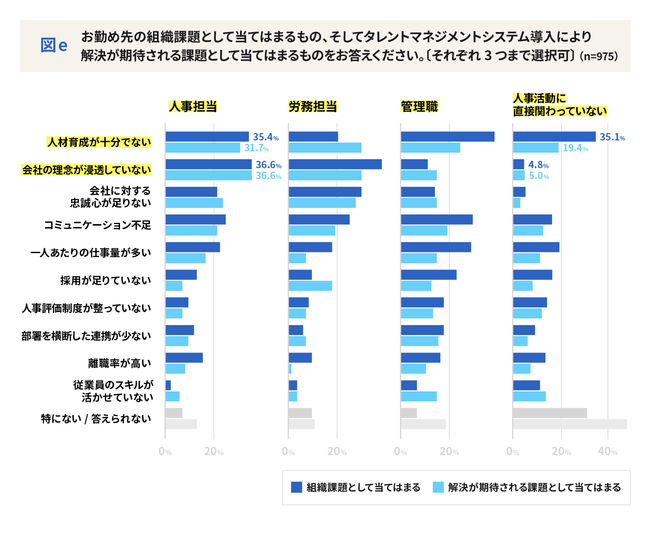 その一方で、人事担当回答の第二位となった「人材育成が十分ではない」という課題に対しては、ポジション問わず「タレントマネジメントシステムに解決を期待する」結果となり、会社へ個々のスキル形成とその成長をサポートする役割が求められていることが反映される結果となりました。
