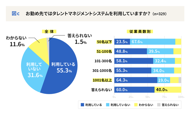 「知っていた」と回答した中で、実際の利用率を見ると55.3%となりました。企業規模からみると従業員数1001名以上が利用が最も多く64.3%となりました。しかし、従業員数50名以下の利用が23.5%なのに対し、従業員数51名-100名の企業になると2倍の48.8%が利用していることが分かりました。従業員数50名を境に人材マネジメントを強化するために導入する企業の様子が分かる結果となりました。
