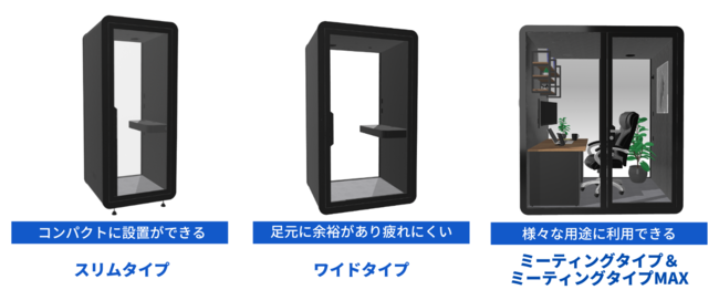 またWeb会議や業務に必要な内部照明、電源やUSBポート、デスク、デスクチェアなどの設備(※)が整っていますので設置後すぐにご利用いただけます。設置スペースの広さや用途に合わせた4タイプを展開しています。