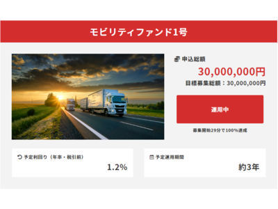 株式会社クラウドファンディングは、一般投資家からクラウドファンディングで資金を募り、運送事業者を金融面で支援するファンド「モビリティファンド(R)」の第1号案件となる「モビリティファンド1号」の募集を2022年11月に行い、開始から29分で完売することができました。運送事業者の経営改善を目的としたクラウドファンディングは本ファンドが日本初* となりますが、弊社では既に第2弾として1.4億円規模の「モビリティファンド2号」の準備も進めており、12月中にも募集を開始する予定です。弊社では「所有から利用する時代へ」のトレンドに合わせて今後もモビリティファンドを組成し、広く運送事業者の経営環境の改善、ドライバーの待遇改善などのSDGsへの取り組みを加速させてまいります。