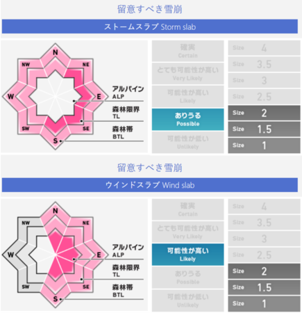 その日に警戒したい「雪崩の種類」が、どの標高帯と方位にあるのか、そして、その雪崩の「誘発の可能性」と、発生した場合の「規模」をグラフィカルなイラストで表現しています。これにより、行動者はフィールドで、どのような「地形選択」がより良いのかを理解することができます。