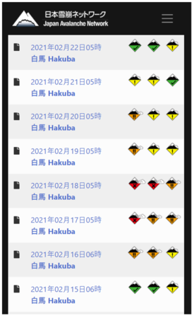 ホームページでは発表されている雪崩情報を地域で絞り込むことができます。これにより、雪崩危険度の推移が一目でわかりますので、週末に向けた行動計画の立案に役立てることができます。