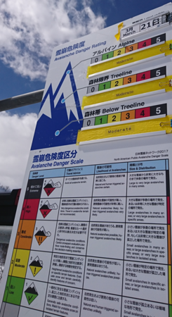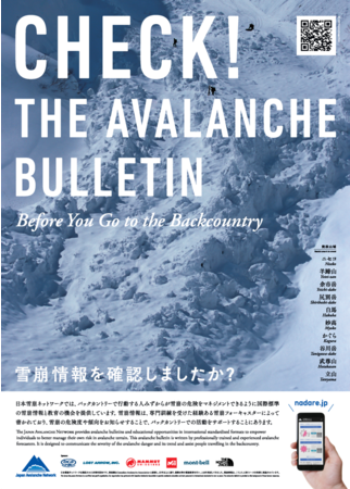 発表される雪崩情報は英語化を行い、海外からJAPOWを求めて来日する方にも利用しやすいものとしました。弊組織の雪崩情報は、欧米と同一形態のため、その理解における齟齬や誤謬が発生しにくく、その効果が期待されるところです。さらに、雪崩情報の利用を推進するため、英語をメインキャッチとしてポスター(A2サイズ)を作成し、発表区域内にあるスキー場や施設等への掲示を進めています。