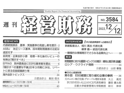 『週刊 経営財務』は、半世紀以上も前から会計分野に専門特化して、しかも週刊誌形態で情報提供し続けてきた日本で唯一の雑誌媒体です。最近の企業会計・会社法等に関わるニュース&トピックスのサマリーや、法律・制度改正の動向や会計基準・指針等の審議状況等を掲載しており、企業会計と企業財務に関わるビジネスパーソンに読まれております。