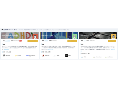 今回新たに提供開始する「先取りキーワードレポート」は、今後グローバルでのさらなる成長が期待される、エネルギー、素材、ヘルスケア、情報技術にフォーカスし、各専門分野に精通したシリコンバレーの現役キャピタリストが、まだ話題になる前のトレンドキーワードを提示。キーワードに加えて、当該分野の概要や課題、さらに課題の解決に有効な手段や技術、検討方法やそれらを有する注目スタートアップなどをわかりやすく解説します。すべてのコンテンツは当社で日本語訳を行います。