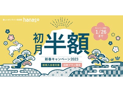株式会社アンフープ(所在地:静岡県富士市、代表取締役社長:重森 渉)がサイト運営する、無料通話ソフトZoomまたはSkypeを利用したオンライン英会話スクール「hanaso」では、2023年1月5日(木) ~1月26日(木)に、新規入会者を対象として回数プラン初月月額料金(4,400円~7,920円)(税込)が半額になる「新春キャンペーン2023」を実施いたします。