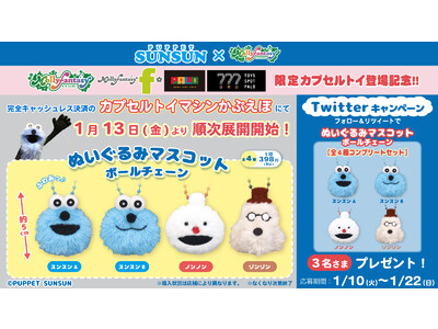 株式会社イオンファンタジー(本社:千葉県千葉市、代表取締役社長:藤原徳也、以下、当社)は、SNSで大人気の「パペットスンスン」より「スンスン」「ノンノン」「ゾンゾン」の「ぬいぐるみマスコットボールチェーン」を、アミューズメント施設「モーリーファンタジー」「PALO」、カプセルトイ専門店「TOYS SPOT PALO」などに設置する当社オリジナル完全キャッシュレスカプセルトイマシン「かぷえぼ」限定のカプセルトイとして1月13日(金)より順次展開いたします。
