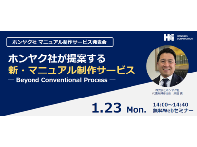 多言語翻訳サービスを展開する株式会社ホンヤク社(代表取締役:原田真)は、この度、マニュアル制作サービスをスタートすることを発表。AI翻訳での多言語展開を前提とした新たなマニュアル制作サービスとなる。あわせて、2023年1月23日(月)にはWebセミナー『ホンヤク社が提案する新・マニュアル作成サービス~Beyond Conventional Process~』と題してサービス発表会を開催予定。