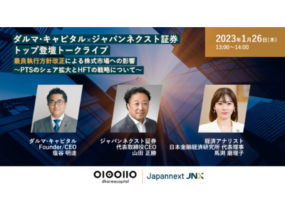 2023年1月26日(木)にオンラインイベント『ダルマ・キャピタル × ジャパンネクスト証券 トップ登壇トークライブ「最良執行方針改正による株式市場への影響 ~PTSのシェア拡大可能性とHFTの戦略について~」』を開催します。