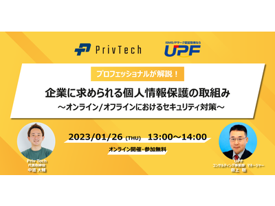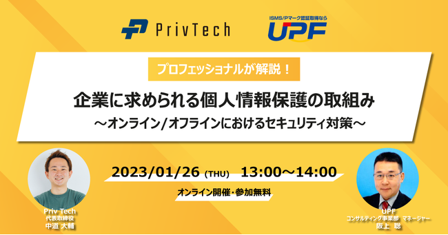 Priv Tech株式会社(本社:東京都港区、代表取締役:中道 大輔、以下Priv Tech)と株式会社UPF(本社:東京都中央区、代表取締役:仲手川 啓、以下UPF)は共同で、無料オンラインセミナー『プロフェッショナルが解説!企業に求められる個人情報保護の取組み ~オンライン/オフラインにおけるセキュリティ対策~』を 2023年1月26日(木)13時より開催いたします。