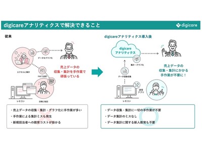 「digicareアナリティクス」は、調剤薬局における売上データの収集・集計を自動化し、日々の集計業務にかかる手作業を大幅に削減します。お使いのレセコンがPHC製以外であっても対応ができ、また、導入に際してシステム開発が必要ないため、スピーディーに利用開始できます。さらに、クラウド上にリアルタイムでデータ保存をするため、お手元の端末を使って、どこからでも最新の情報にアクセスすることが可能です。