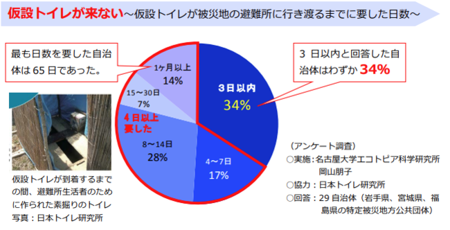 仮設トイレが設置されるまでには4日以上かかったところが半数以上ということがわかっています。災害が起きた瞬間は命を守ることが最優先ですが、その後の生活においてトイレ問題は重要です。