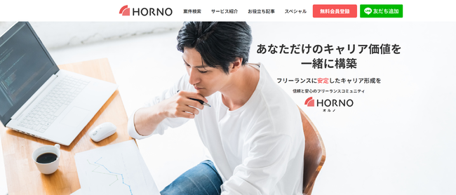 https://horno.jp/)は「フリーランスに安定したキャリア形成を」というコンセプトに、フリーランスの皆様の”本物のキャリア価値”を一緒に構築することを目指すフリーランスコミュニティサービスです。