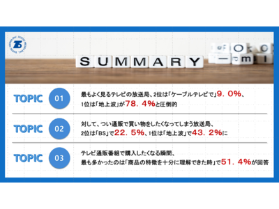 最も視聴するテレビの放送局は、ほとんどが「地上波」で回答する方が多かった事に対し、つい買いたくなるようなテレビ通販番組を放送している放送局となると、「地上波」だけではなく、「BS」も上位に挙がっていることが明らかになりました。半数以上が、「商品の特徴を十分に理解できた時」にテレビ通販番組で商品を購入したくなると回答しており、一方で「商品にメリットを感じられなかった」や「インターネット通販のほうが安かった」となると、テレビ通販番組では商品を購入しない判断をする方がいるようです。