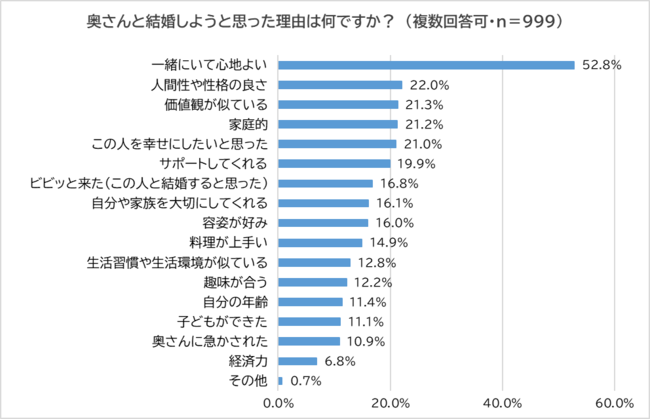 最後に、「奥さんと結婚しようと思った理由」を尋ねたところ、半数以上(52.8%)が「一緒にいて心地よい」と回答。以下「人間性や性格の良さ」(22.0%)、「価値観が似ている」(21.3%)、「家庭的」(21.2%)、「この人を幸せにしたいと思った」(21.0%)となり、「経済力」(6.8%)も僅かながらいました。