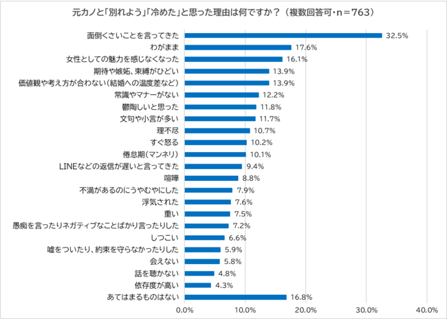 続いて、「元カノと『別れよう』『冷めた』と思った瞬間はあるか?」と尋ね、「ある」と回答した763人に「そう思った理由」を尋ねたところ、他の理由を大きく引き離し「面倒くさいことを言ってきた」(32.5%)が最多となりました。