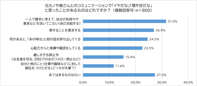 「元カノや奥さんとのコミュニケーションで『イヤだな』『理不尽だな』と思ったことはあるか?」と尋ね、「ある」と回答した800人に「それはどのようなコミュニケーションだったのか?」尋ねました。「一人で勝手に考えて、自分の気持ちや意見などを訊いてこない(自己完結する)」(31.5%)が最多となり、「察することを要求する」(26.9%)、「何かあると『あの時は』と前の話を持ち出してくる」(24.5%)、「心配だからと束縛や確認をしてくる」(22.5%)と続きました。