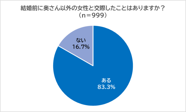 「結婚前に奥さん以外の女性と交際したことはあるか?」と尋ねたところ、「ある」(83.3%)、「ない」(16.7%)となりました。