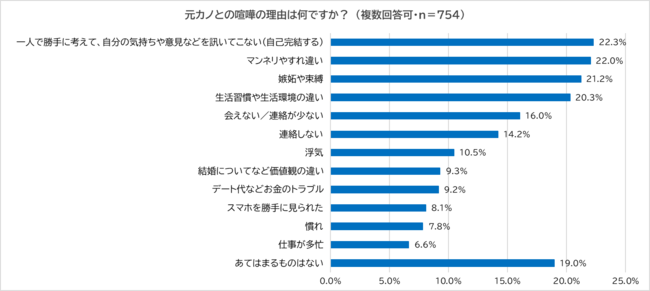 今度は、「結婚前に奥さん以外の女性と交際したことがある」と回答した832人に「元カノと喧嘩したことはあるか?」と尋ね、「ある」と回答した754人に「喧嘩の理由」を尋ねました。こちらでも最多は「一人で勝手に考えて、自分の気持ちや意見などを訊いてこない(自己完結する)」(22.3%)となり、以下「マンネリやすれ違い」(22.0%)、「嫉妬や束縛」(21.2%)、「生活習慣や生活環境の違い」(20.3%)となりました。