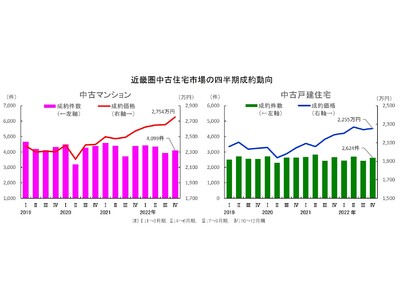 (公社)近畿圏不動産流通機構が1月24日に発表した2022年10~12月期の近畿圏の中古マンション成約件数は、4,099件(前年同期比マイナス6.6%)と再び減少し、市場の売り出し(新規登録)件数は14,022件となりました。成約件数は近畿圏の対象12地域中9地域が前年比で減少し、減少エリアは前期比で5地域増え、取引が軟調なエリアが目立ちました。