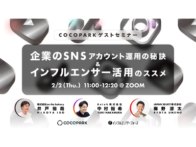 SNS運用・インフルエンサーPRのためのプラットフォーム「COCO PARK」と「インフルエンサーフォース」を運営する株式会社on the bakery(本社:東京都港区 代表取締役:井戸 裕哉)と、地域密着型メディア「JAPAN SELECT」を運営するJAPAN SELECT株式会社(本社:東京都渋谷区 代表取締役:梅野 涼太)、SNS運用代行を行うKeioh株式会社(本社:北海道札幌市 代表取締役:広瀬 章光)は、2023年2月2日 (木)、COCO PARKゲストセミナー『【PR担当者必見】企業のSNSアカウント運用の秘訣&インフルエンサー活用のススメ』を開催いたします。