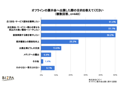 広告プラットフォーム「BIZPA」を運営する株式会社ビズパは、オフライン展示会出展経験のある方440名を対象に展示会出展の目的や課題に関する調査を実施いたしました。