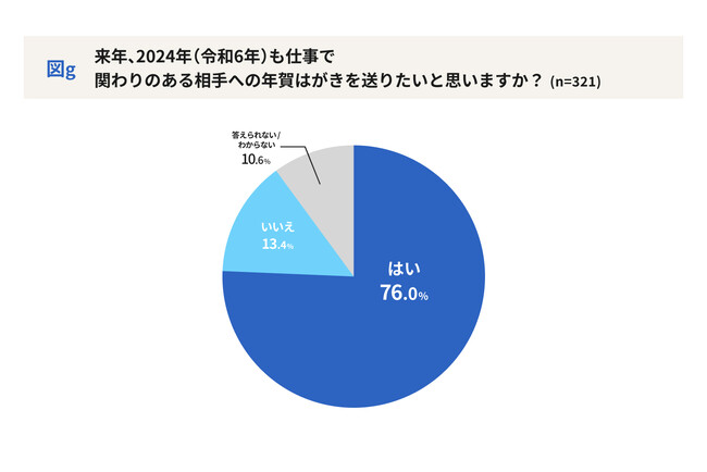 最後に今年年賀はがきを送った人に来年2024年(令和6年)も同様に年賀はがきを送りたいか尋ねたところ「はい」と回答があったのは全体の76%でした。その理由として、第一位「相手へのマナーとして」、第二位「関わりを途絶えさせないため」第三位「所属する組織の方針だから」と回答が寄せられました。