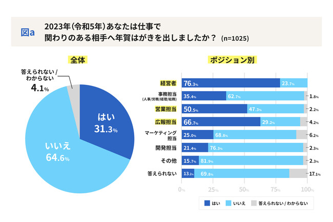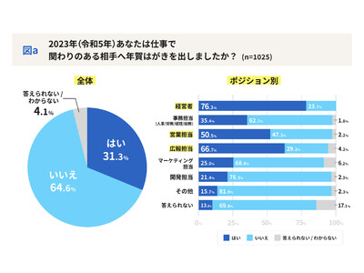 2023年も始まって早1ヵ月が経ちました。「2023年(令和5年)仕事で関わりのある人へ年賀はがきを出した人」を調査したところ、「はい」と回答があったのは31.3%と全体の回答者の3割となりました。ポジション別でみると、経営者・役員が最も多く、「はい」と答えた人が76.3%にのぼり、次いで広報担当の66.7%、営業担当は半数の50.5%となりました。