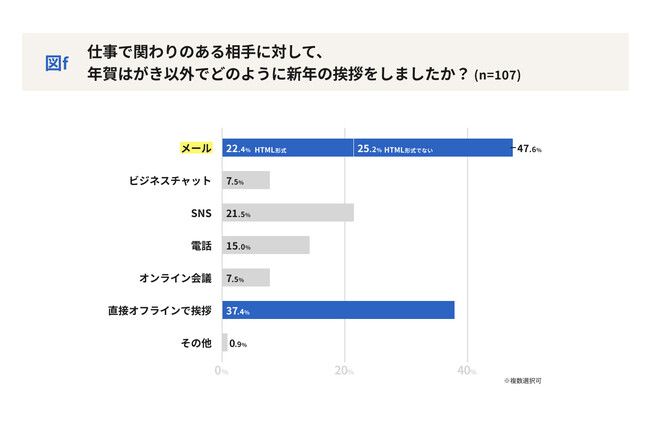 「仕事で関わりのある相手に対して年賀はがき以外でどのように新年の挨拶をしたか」という質問に対して、メールが第一位となりました。一方でオフラインで挨拶するという声も目立ってきており、会うことができる状況であれば対面を選んで挨拶する傾向も戻ってきているといえそうです。