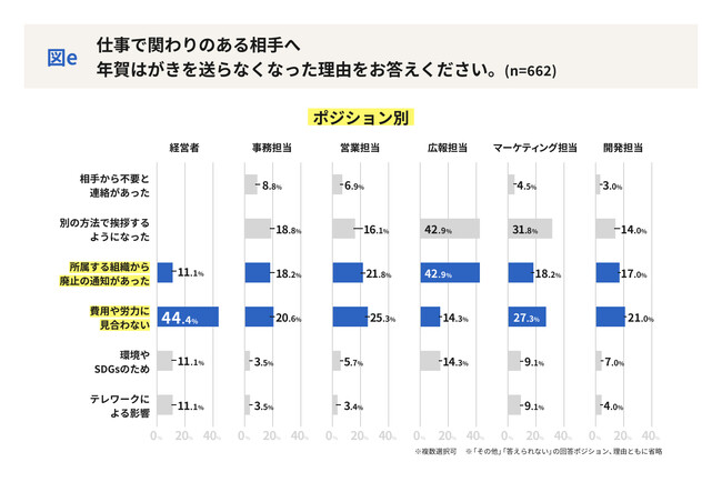 「年賀はがきを送らなくなった理由」を尋ねたところ、全体の回答第1位は「費用や労力に見合わない」、第2位「別の方法で挨拶するようになった」、第3位「所属する組織から廃止の通知があった」からとなりました。ポジション別でみると、経営者の多くが「費用や労力に見合わない」と判断し、自ら年賀はがき送付の廃止を決め、他担当が「所属する組織から廃止の通知があった」と判断に従った様子がわかります。
