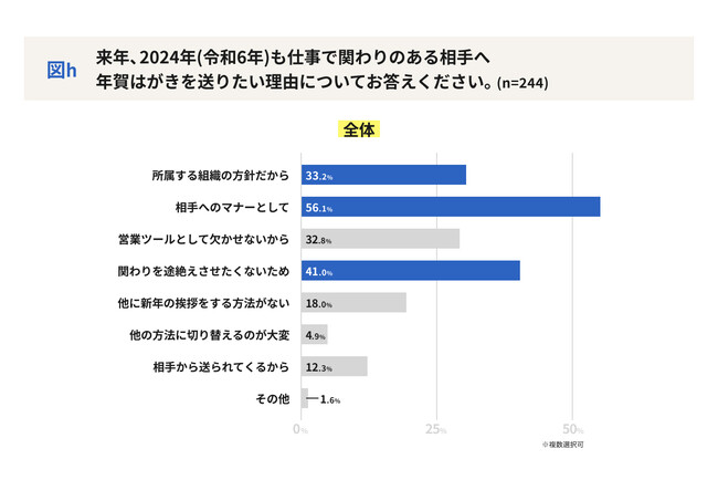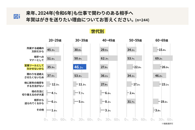 一方、年代別でみると30代では理由の第三位に「営業ツールとして欠かせないから」が入りました。メールやITツールに慣れた世代ではありますが、あえて年賀はがきを送ることで相手の目に留まるようアピールすることを選んでいるともいえる結果となりました。