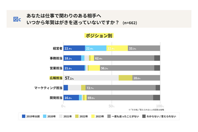 さらに、「いつから年賀はがきを送っていないか」を尋ねたところ、「2019年以前から送っていない」との回答が14.7%でした。ポジション別でみると、広報担当を介して出していた年賀はがきは2021年に6割近くが「送らない」と判断したことが分かり、リモートワークや勤務体制の変化など、間接的にコロナ感染拡大の影響を受けたことが窺える結果となりました。