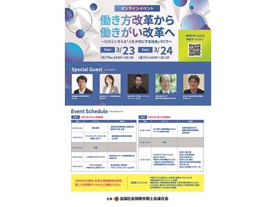 全国社会保険労務士会連合会(会長:大野 実)では、本年3月23日、24日に、事業主や労働者など、広く国民向けたオンラインイベント「働き方改革から働きがい改革へ~社労士と考える「人を大切にする社会」づくり~」を開催します。
