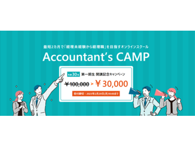 プロフェッショナル・エージェンシー事業を展開する株式会社クリーク・アンド・リバー社(以下C&R社)の会計分野の子会社・ジャスネットコミュニケーションズ株式会社(以下JC)は、未経験から経理職にチャレンジされたい方を対象とした、経理・会計実務のオンラインスクール「Accountant's CAMP(アカウンタンツキャンプ)」を開講し、このたび、受講生の募集をスタートいたしました。なお、定価10万円のところ、先着30名に限り特別価格3万円(税込)でご受講いただける開講記念キャンペーンも実施中です。