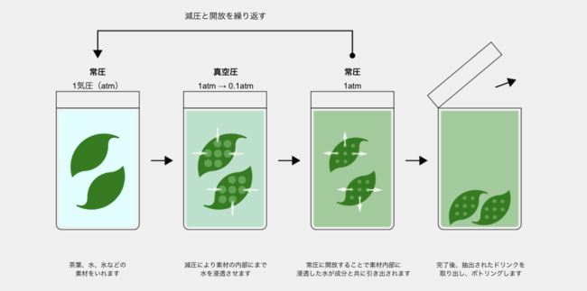 ボタニカル素材は抽出した瞬間から時間とともに雑菌が増え、酸味や苦味の原因になります。低温の水出し抽出は旨味成分を強く引き出せる一方、抽出時間が長くなることで雑味が増え、本来の美味しさが損なわれるという課題がありました。しかし、コールドローは独自の減圧技術と温度管理による高速抽出により、極めて雑味の少ない「できたてのクラフトノンアルコールドリンク」を10分で抽出できます。コールドローは国内で特許を取得した独自技術です(特許第7020730号)。