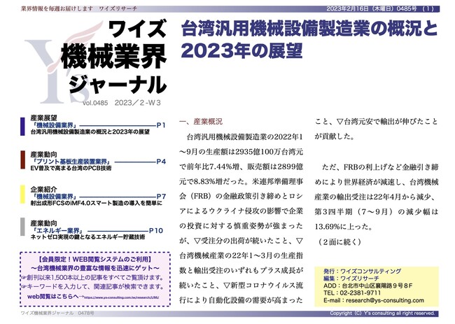 ワイズコンサルティング グループ(本社:中華民国台北市、代表取締役:吉本康志)は台湾機械業界専門誌「ワイズ機械業界ジャーナル」の2023年2月第3週号を発行しました。今週号では、機械設備業界、プリント基板生産装置業界、プラスチック射出成形機械メーカーとエネルギー業界の最新動向を紹介します。