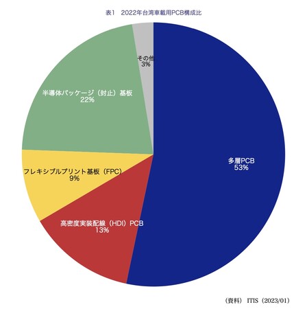 台湾製車載用PCBは多層PCBが全体の約63.5%を占める。主なメーカーは車載用PCB世界4位の敬鵬工業(チンプーン・インダストリアル)や、精成科技(グローバル・ブランズ・マニュファクチャー、gbm)、健鼎科技(トリポッド・テクノロジー)などだ。台湾製車載用PCBで次に多いのが高密度実装配線(HDI)PCBで、全体の約15.8%を占める。主なメーカーは敬鵬工業や燿華電子(ユニテック・プリンテッド・サーキット・ボード)などだ。このほか、フレキシブルプリント基板(FPC)が全体の10.7%、半導体パッケージ(封止)基板が6.9%を占める。