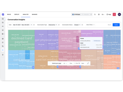 以前の顧客とのやり取りを生産的に活用することで、バーチャルアシスタントの開発スピードを加速させることが可能です。ユーザーとエージェント間のチャット/通話記録からトピックを特定し、インテントとエンティティを抽出します。会話を確認し、バーチャルアシスタントに新しいインテントを追加する、または既存のインテントをトレーニングすることで認識率を高めることができます。