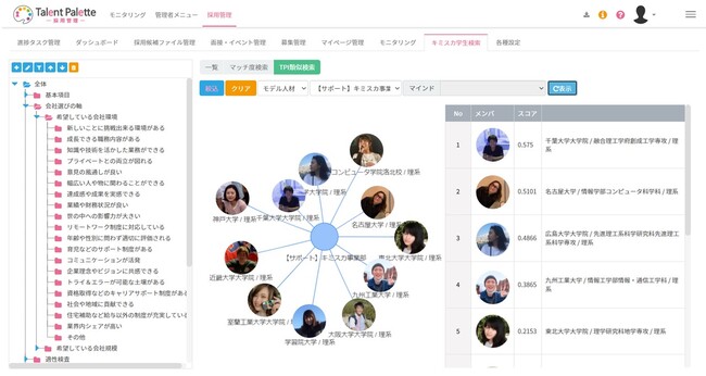 また企業の学生検索の精度向上、人材データの分析機能の拡充により、将来の活躍人材の発見とアプローチが可能になります。新たに加わった採用管理機能によって、キミスカは学生と出会うためのツールから、入社までの全てのプロセスを包括して管理できるツールへ。更に今年度から連携をしたタレントマネジメントシステムの『タレントパレット』にて入社後も継続的に人材データを蓄積していくことで、次世代の活躍人材の採用、育成を実現します。