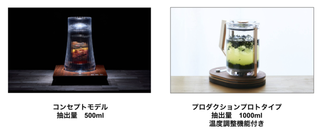 SXSW 2023ではCOLDRAWのコンセプトモデルに加えプロダクションプロトタイプを展示し、2つの方向性からCOLDRAWへの期待や需要をより具体的に模索します。コンセプトモデルは、ボタニカル素材の形状や色味などの魅力が視覚的に感じられ、その佇まいもこれまでの抽出機器と一線を画す意匠設計を目指したのに対し、プロダクションプロトタイプは飲食店や自宅などで使用することを念頭にシンプルなティーポットに近い形へ改良。飲料の抽出工程を視覚的に楽しめるデザインはそのままに、持ち手がついているのでドリンクを直接グラスへ注ぐことができる他、ボタニカル素材に合わせて最適な温度で抽出できるよう温度調整機能がついています。